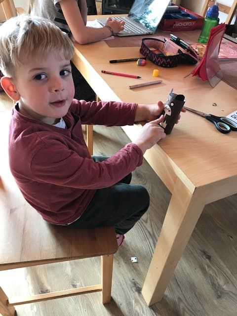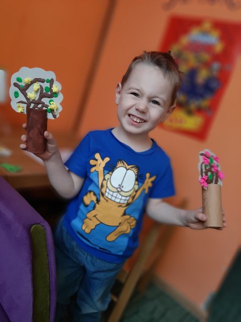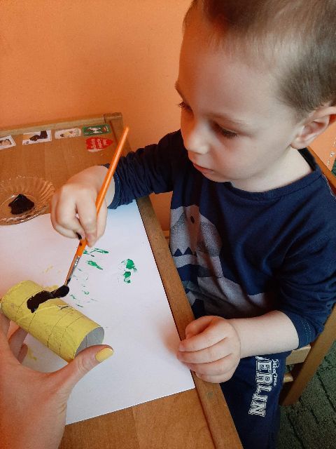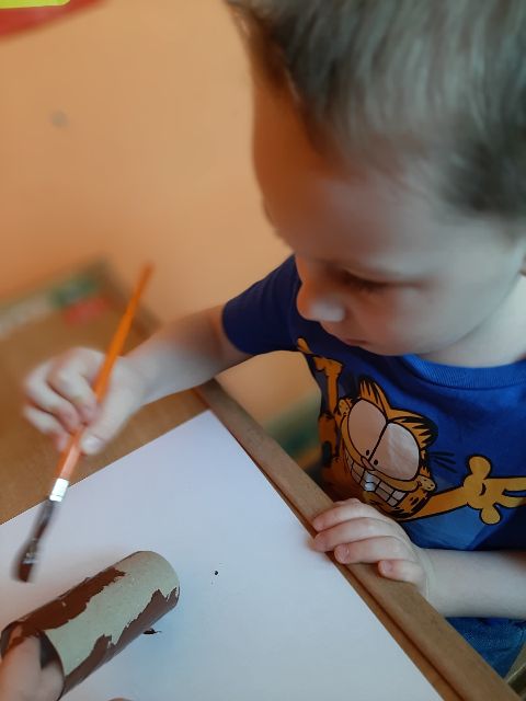 Rolkę po papierze Jaś maluje na brązowo i powstaje recyklingowy pień drzewa
