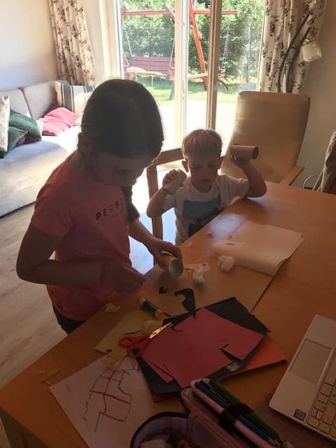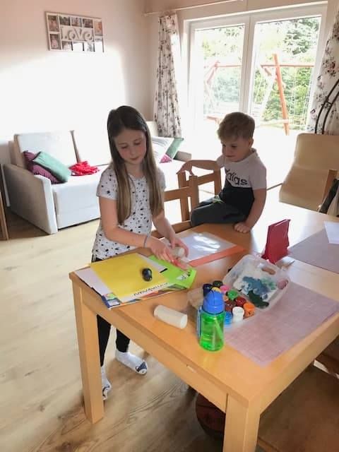 August razem z siostrą przygotowują stanowisko do prac plastycznych
