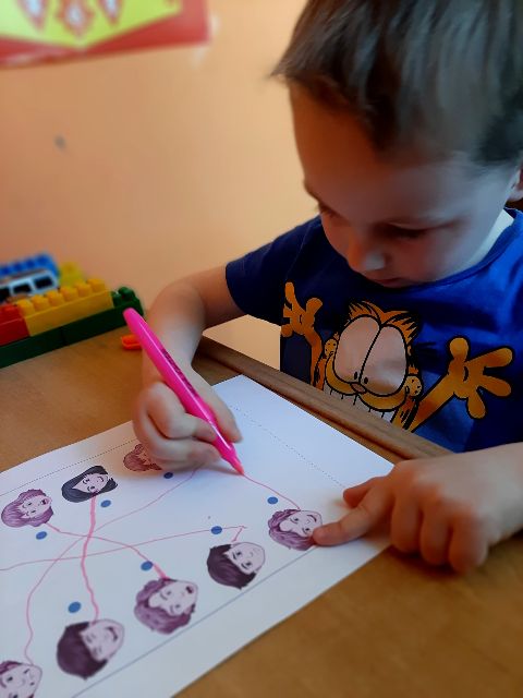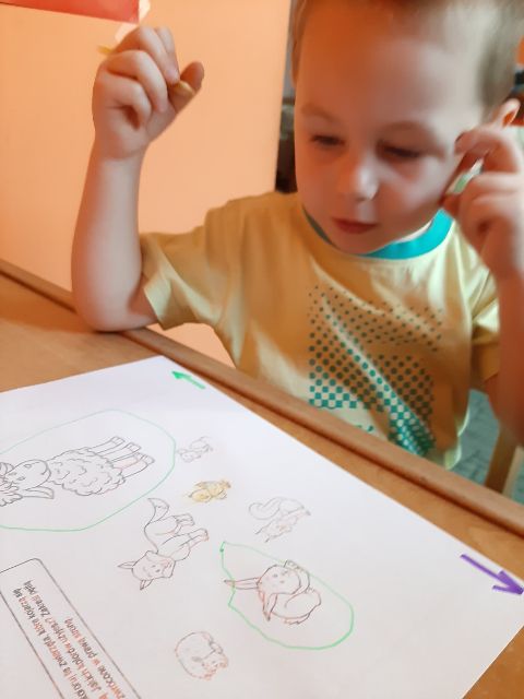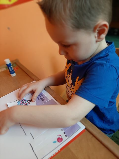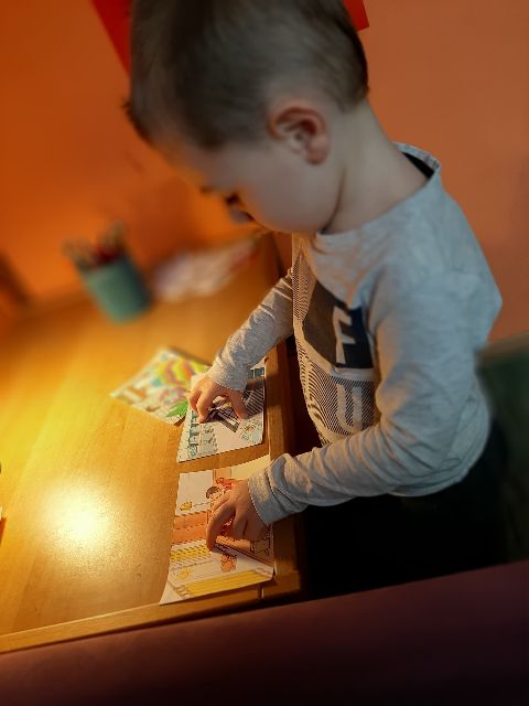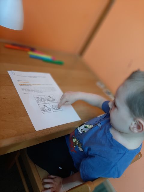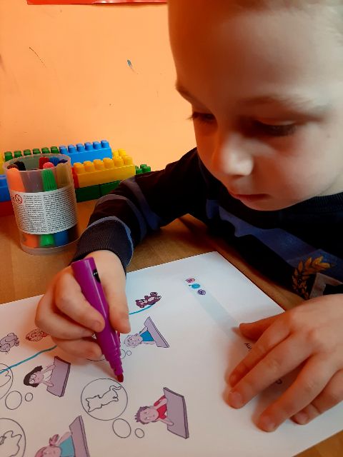 Jaś podczas wykonywania balonikowej karty pracy