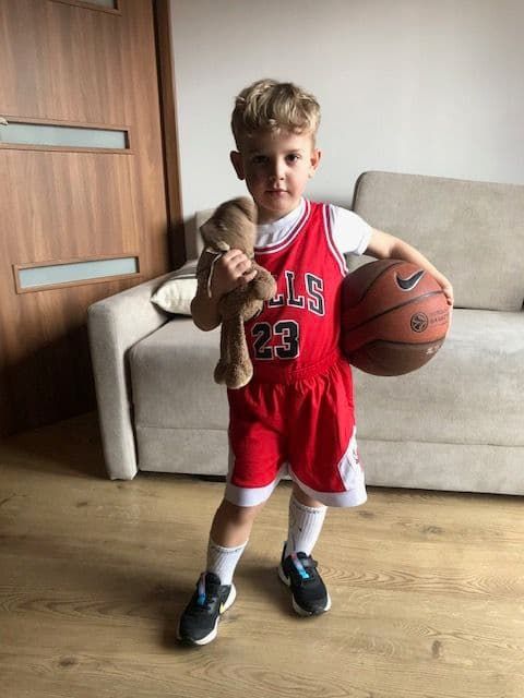 Dziś August ze swoim ukochanym misiem na sportowo