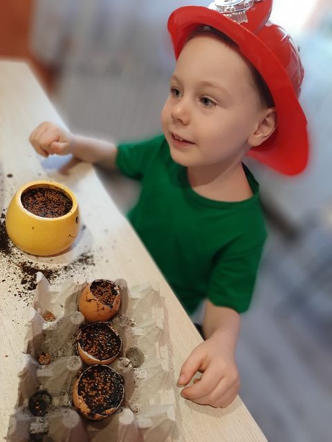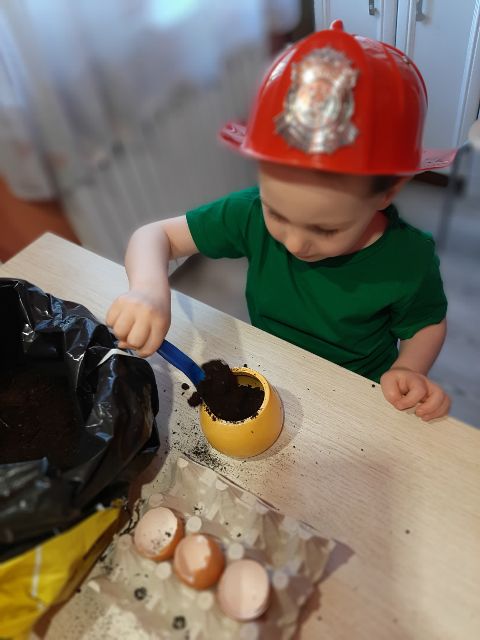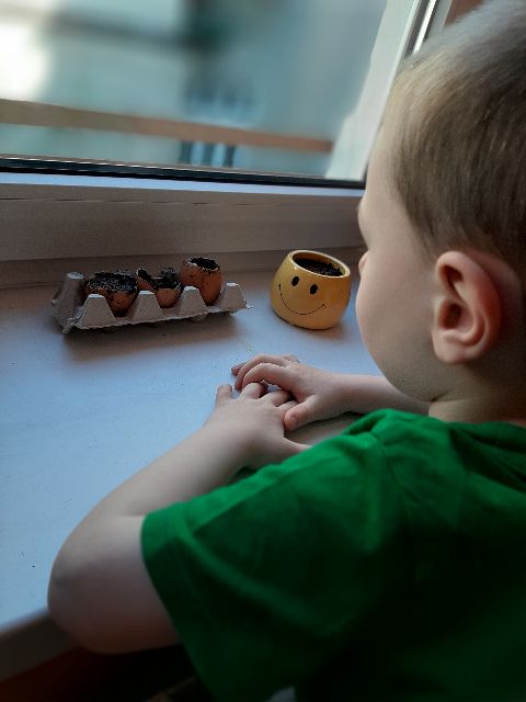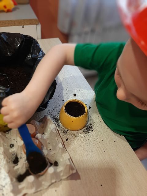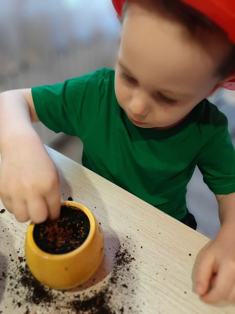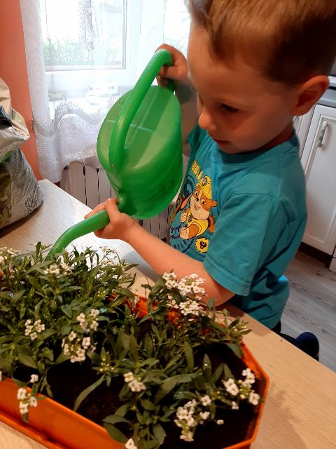 Roślinki po przesadzeniu potrzebują wody - Jaś o tym pamięta