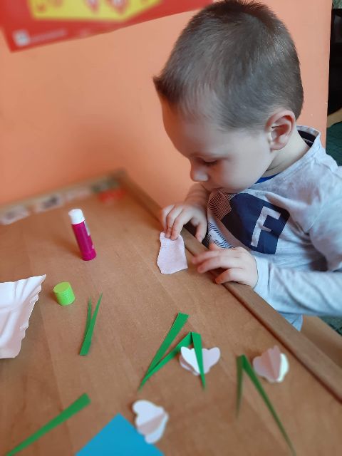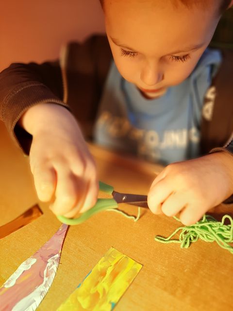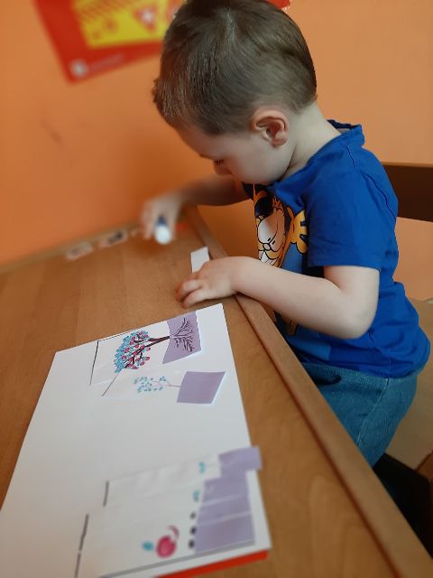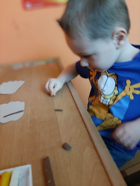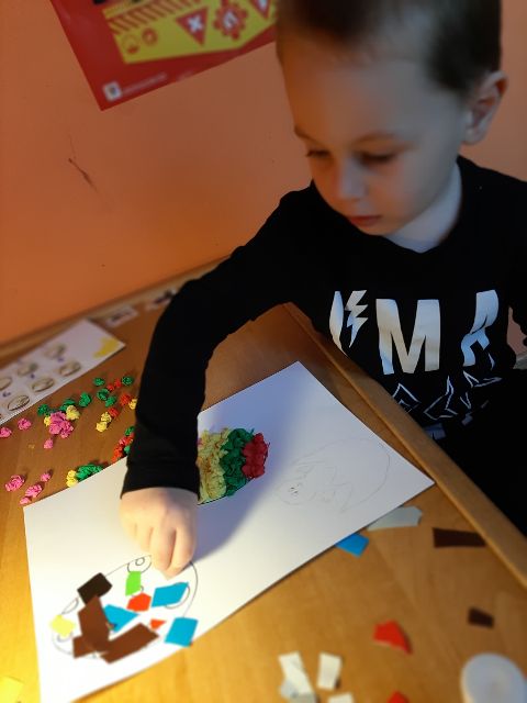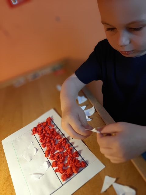 Przed rozpoczęciem kolejnej pracy, Jaś musi przygotować sobie materiał - kręci kuleczki z bibuły