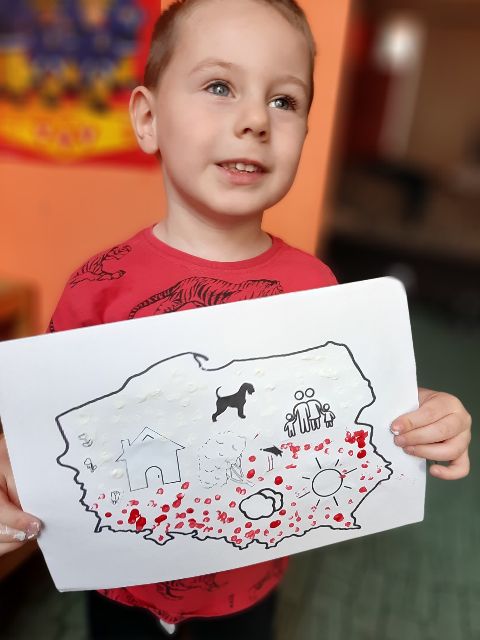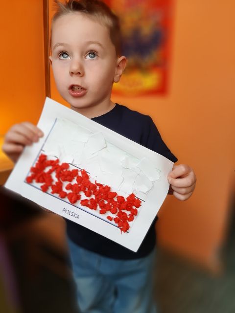 Potargane białe kawałki papieru posłużyły Jasiowi jako wypełnienie górnej części flagi