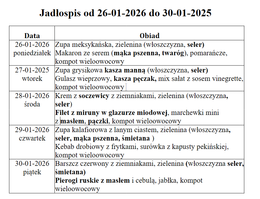 W niniejszym jadłospisie wyróżniono substancje lub produkty powodujące alergie lub reakcje nietolerancji zgodnie z załącznikiem II do Rozporządzenia Parlamentu Europejskiego i Rady (UE) nr 1169/2011 z dnia 25 października 2011r.